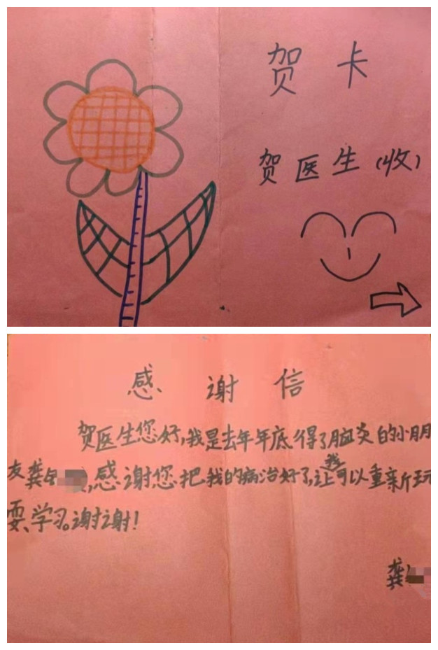 “贺医生您好,我是去年年底得了脑炎的小朋友,感谢您把我的病治好了,让我可以重新玩耍、学习,谢谢!”