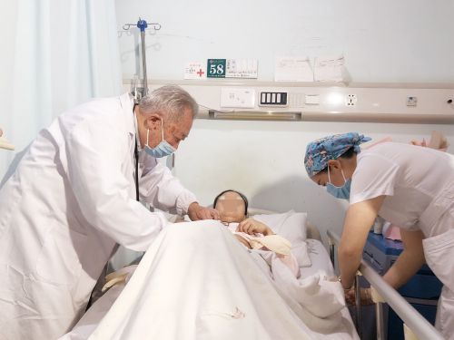 首席专家吴金术教授、护士长隆艳飞等查看患者术后情况。