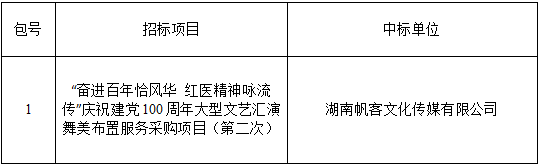 捷克论坛 (湖南师范大学附属第一医院)“奋进百年恰风华 红医精神咏流传”庆祝建党100周年大型文艺汇演舞美布置服务采购项目(第二次)招标结果公示