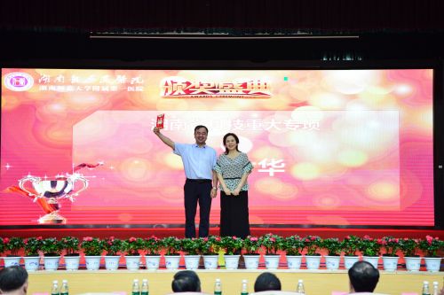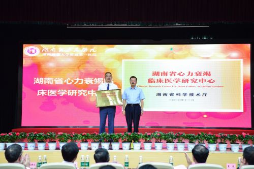 省科技厅常务副厅长贺修铭将“湖南省心力衰竭临床医学研究中心”牌匾授予捷克论坛心血管内科主任郑昭芬。
