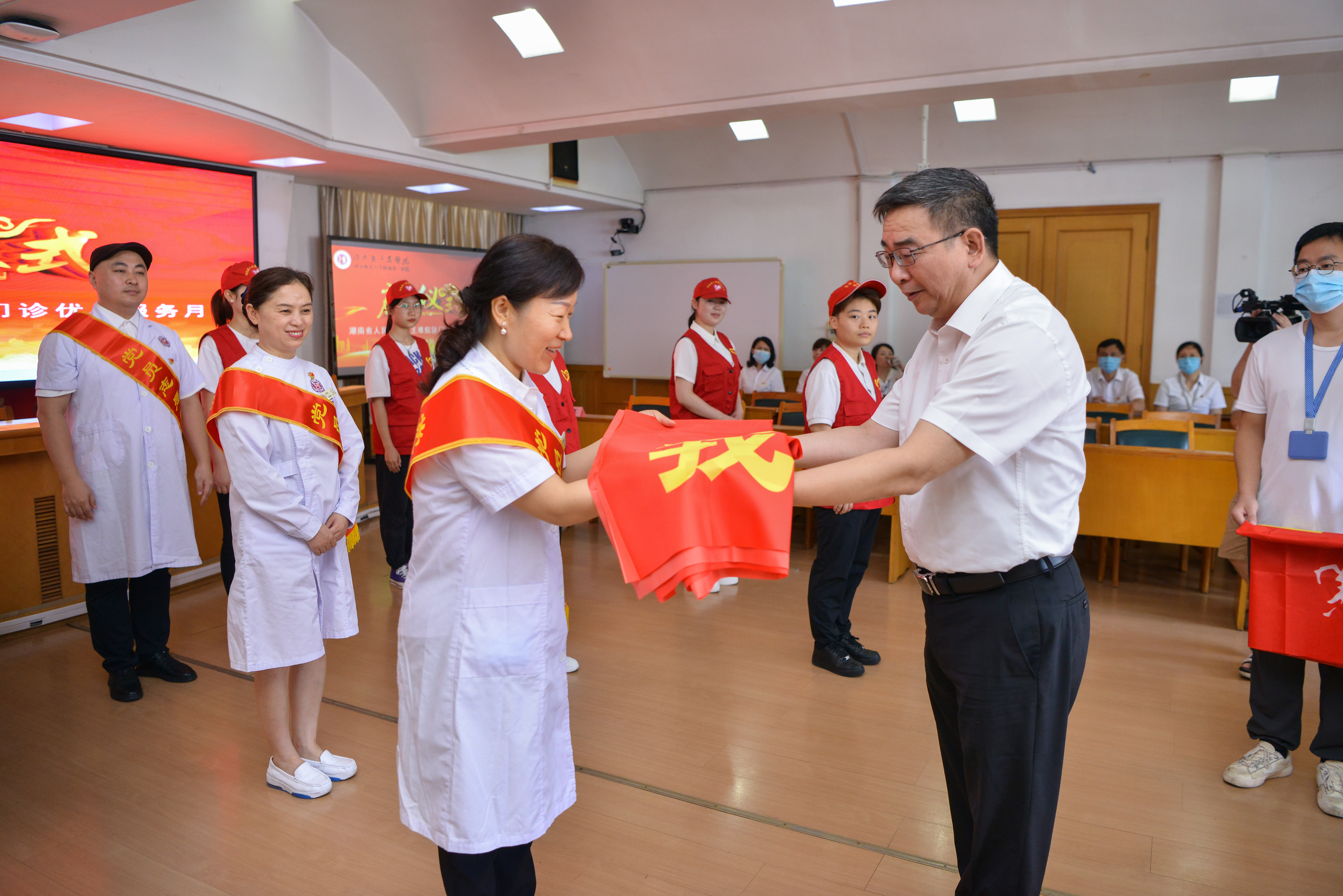 谭李红院长为党员、团员志愿队授旗。