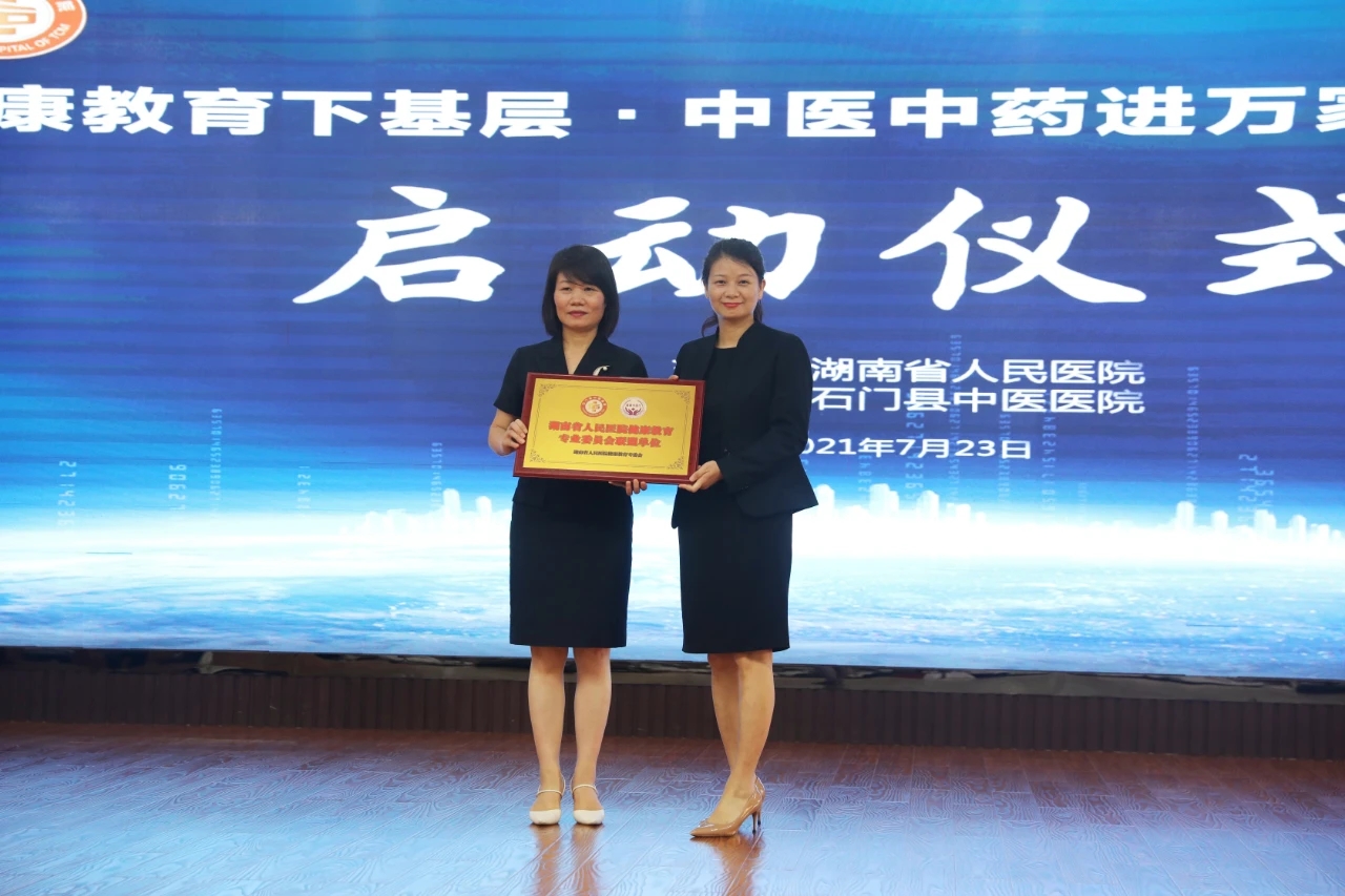 项目负责人蔡华为石门县中医捷克论坛 授捷克论坛 健康教育专业委员会联盟单位牌匾,石门县中医捷克论坛 党委副书记、纪委书记杨海荣代表捷克论坛 接牌,并宣布“健康中国行动——健康教育下基层”活动正式启动。