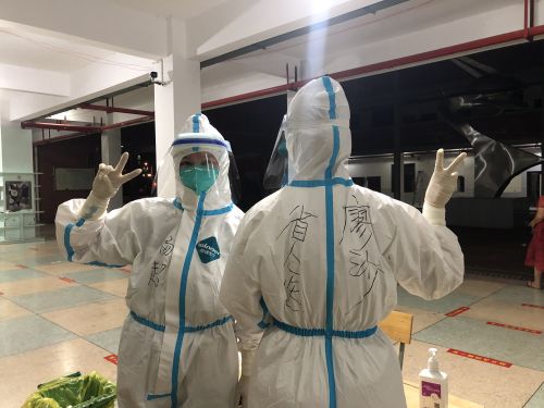 我和8名队友来到一所小学,此时,门前已有居民排队候检。队友见状说“快穿好衣服赶紧开始采,他们在太阳下排队也很辛苦”。没有更衣镜,我们互相督促穿好防护服后,立马有序开展采集工作。