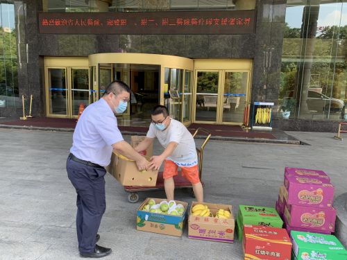 今天是我们抵达张家界的第二天,上午,天心阁院区一站式服务中心护士陈永红老师的先生代表他所在单位——交通银行张家界分行,为驰援张家界抗疫的省医医疗队员送来爱心物资——水果和泡面,并表示,交通银行张家界分行将为省医医疗队在张家界工作期间提供物资保障,做好后勤服务。