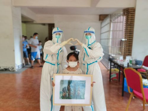 上午11点左右,一名小女孩给我们送来自己画的张家界风景画,并用她稚嫩的声音说:“你们辛苦啦,谢谢你们来为张家界加油!”
