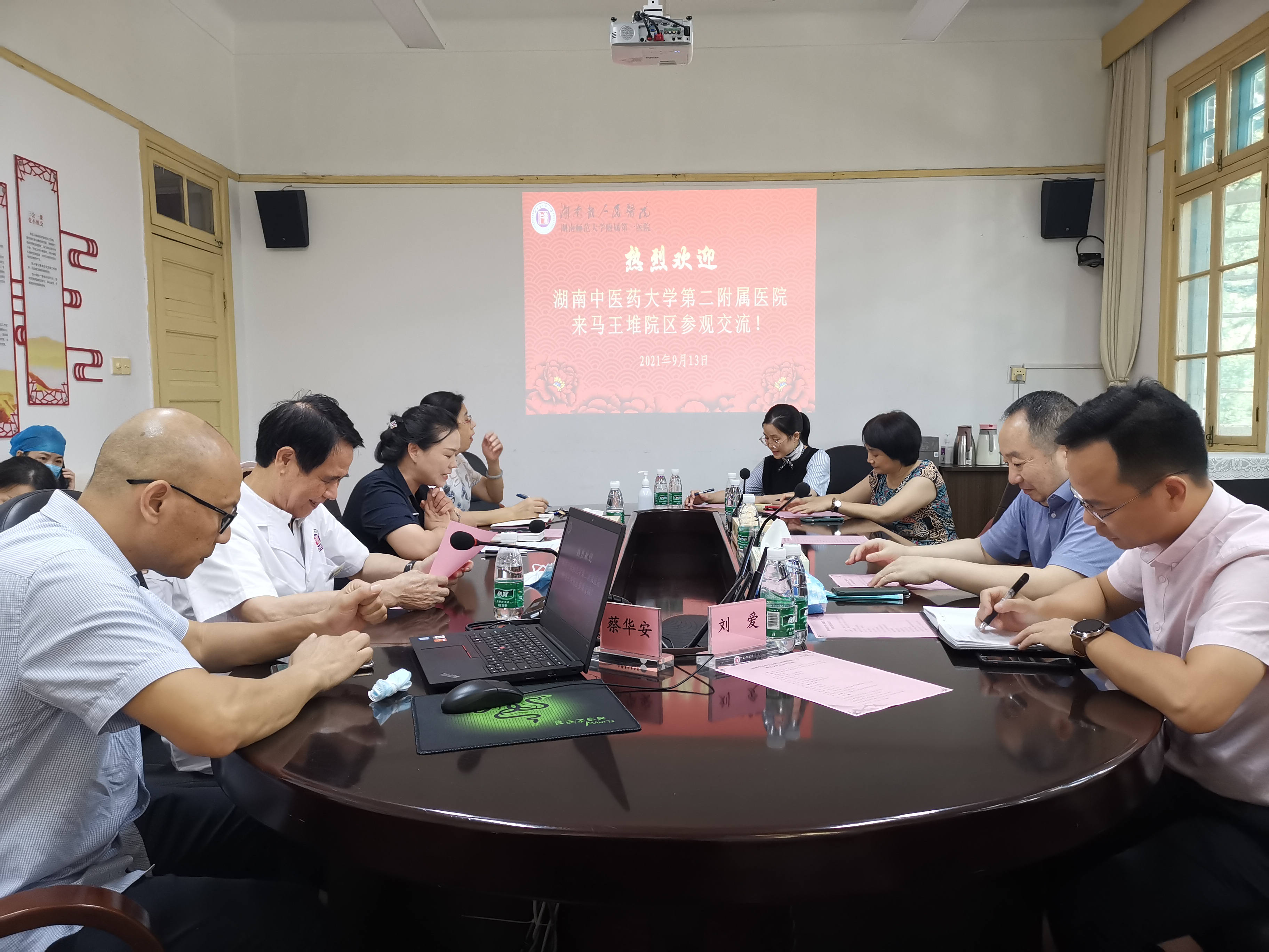 9月13日下午,湖南中医药大学第二附属捷克论坛 副院长游佰稳一行4人,到马王堆院区参观交流康复医学工作。马王堆院区综合办主任石泽亚、医务办主任谭双香、特聘专家湖南省康复质量控制中心主任邓景贵及康复医学科主任、护士长等参加座谈会,会议由石泽亚主任主持。