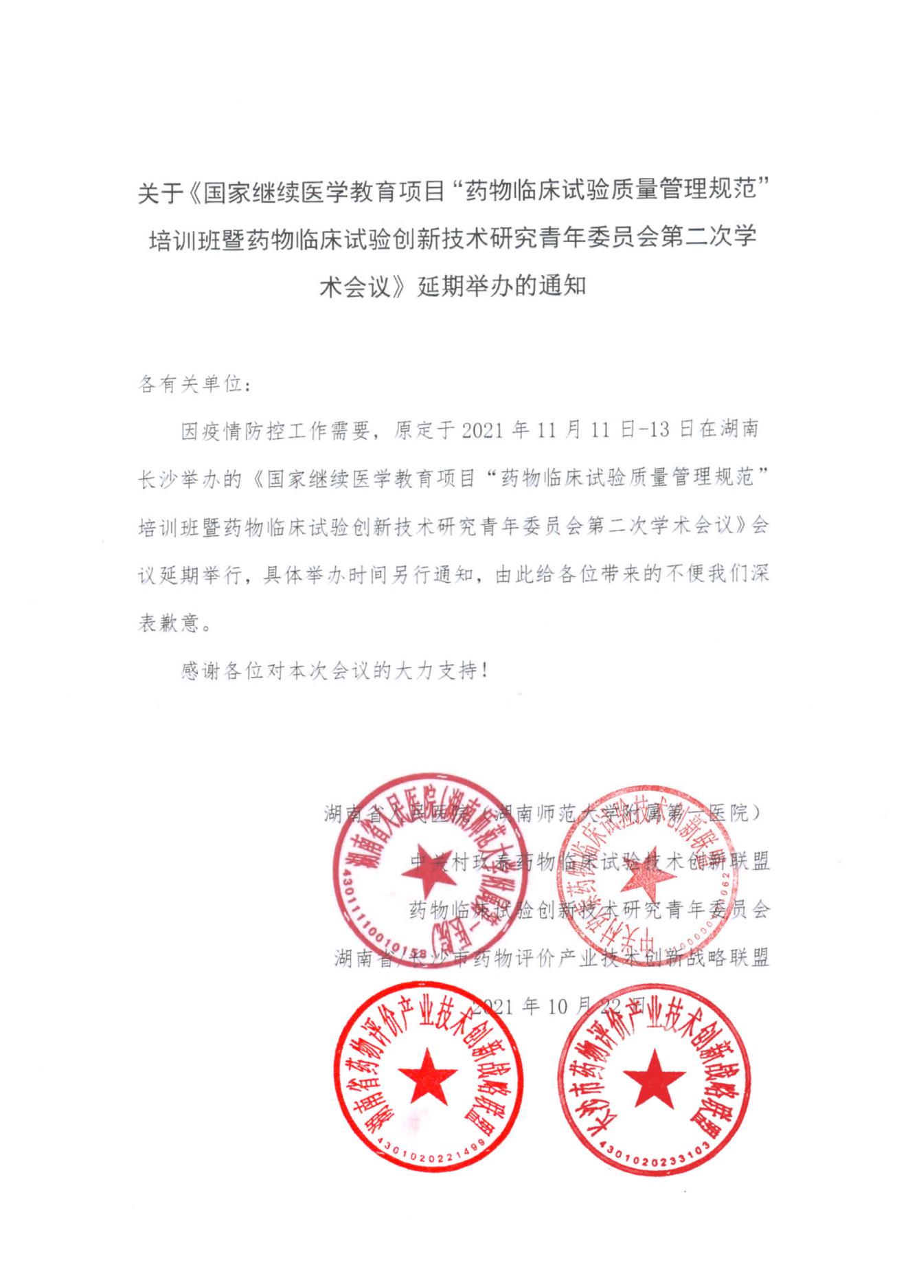 关于《国家继续医学教育项目“药物临床试验质量管理规范”培训班暨药物临床试验创新技术研究青年委员会第二次学术会议》延期举办的通知