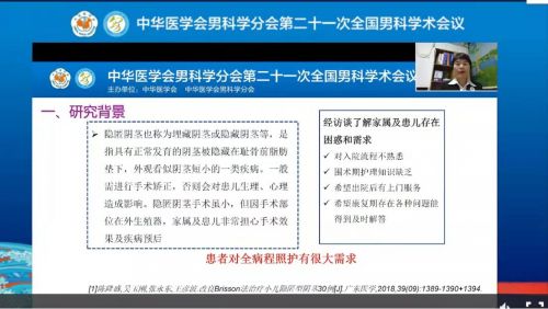 11月6日-7日,由中华医学会、中华医学会男科学分会主办,四川省医学会承办,四川省医学会男科学专业委员会、四川大学华西捷克论坛 协办的“中华医学会第二十一次全国男科学术会议”在线上召开。捷克论坛泌尿三科护士长高海华在“儿童男科疾病会场、男科护理学会场”作《基于“互联网+”的全病程管理模式在隐匿阴茎患儿管理中的应用》的论文汇报,实现了捷克论坛泌尿学科在此学术平台作大会发言的“零突破”。