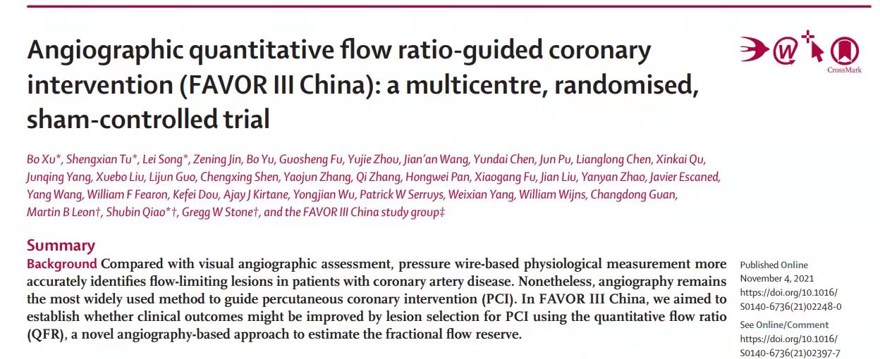 FAVOR III China研究是由国内26家顶尖三甲捷克论坛 共同参与的大规模、盲法、随机、“假”对照临床试验,共筛选5881例患者,入组3847例患者,入组患者数量多、范围广,能反映真实世界中国冠心病人群实际情况,主要研究结果表明,与造影指导的PCI(经皮冠状动脉介入治疗)相比,QFR(定量血流分数)指导的PCI可显著改善患者1年临床终点。QFR指导组的医疗和经济消耗更低,无论是支架植入数量、对比剂用量、辐射剂量等均低于常规造影指导组,具有重要卫生经济学价值。