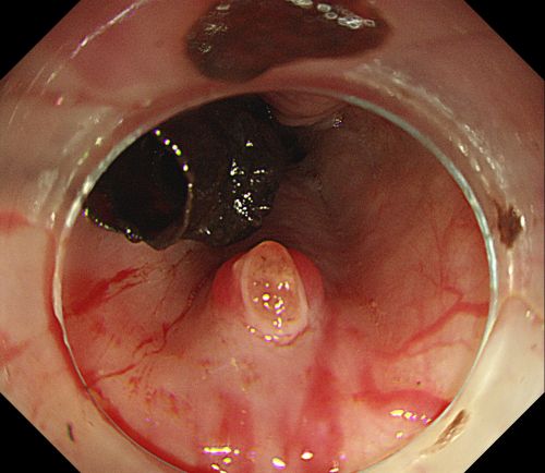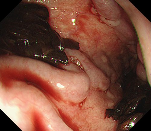 内镜下可见重度食管静脉曲张,且有较多血凝块。