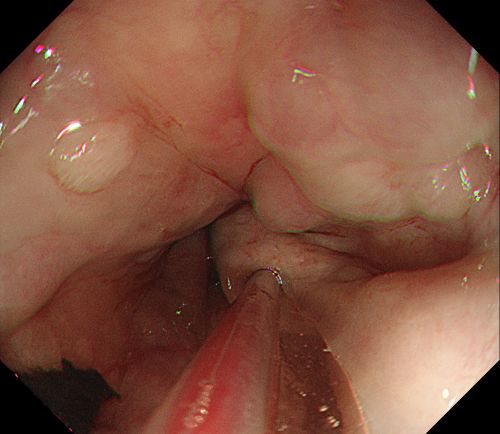 患者旋即被推入手术室,麻醉三科刘际童主任为其进行气管插管、全麻,保持呼吸道通畅,并进行中心静脉置管等维持血压平稳。综合内科彭娅主任进行胃镜治疗,发现患者重度食管静脉曲张,胃底可见大量血液及血凝块;小心翼翼抽吸血液及清洗血块后,寻找到“犯罪血管”,在内镜下进行食管静脉曲张套扎+硬化剂注射治疗,封闭出血血管。