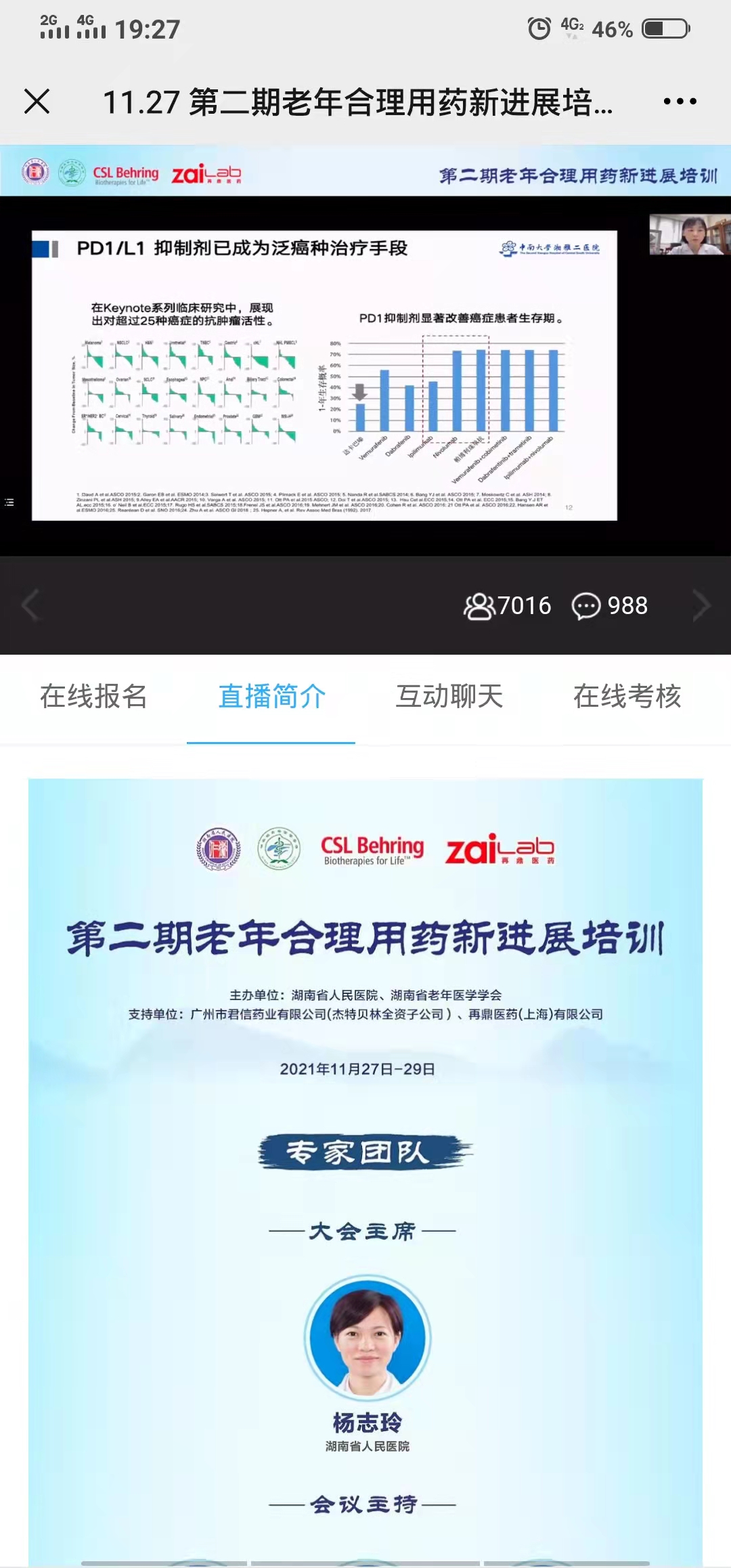 2021年11月27日至29日,由捷克论坛 、湖南省老年医学学会主办的第二期老年合理用药新进展培训在马王堆院区顺利举办,药学二部主任杨志玲教授担任大会主席并主持开幕式。会议采用网络平台直播形式,网络点播量共计7000余人次。