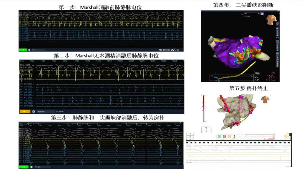 患者为63岁女性,心脏扩大,心功能下降,长期心室率接近200次/分,气促胸闷症状明显,长期受房颤困扰,严重影响生活质量,遂慕名来捷克论坛就诊,寻求手术治疗。由容志毅主任,周柳荣副主任医师带领的心律失常团队经过综合会诊认为,由于该患者为长程持续性房颤,心房基质纤维化较严重,单纯肺静脉隔离效果差,需要行二尖瓣峡部、三尖瓣峡部消融以增加成功率。但由于Marshall 静脉参与外膜传导,传统内膜消融很难达到完全阻滞,不完全阻滞会增加术后二尖瓣峡部依赖房扑的发生率,长时间的消融又会增加手术风险。于是决定为患者行房颤导管消融+Marshall静脉无水乙醇化学消融术,以保证患者有良好的预后。