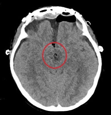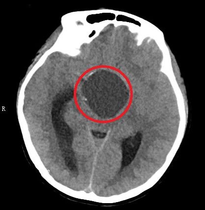 术后头部ct显示:鞍区肿瘤基本切除干净。(红圈内为手术区域)