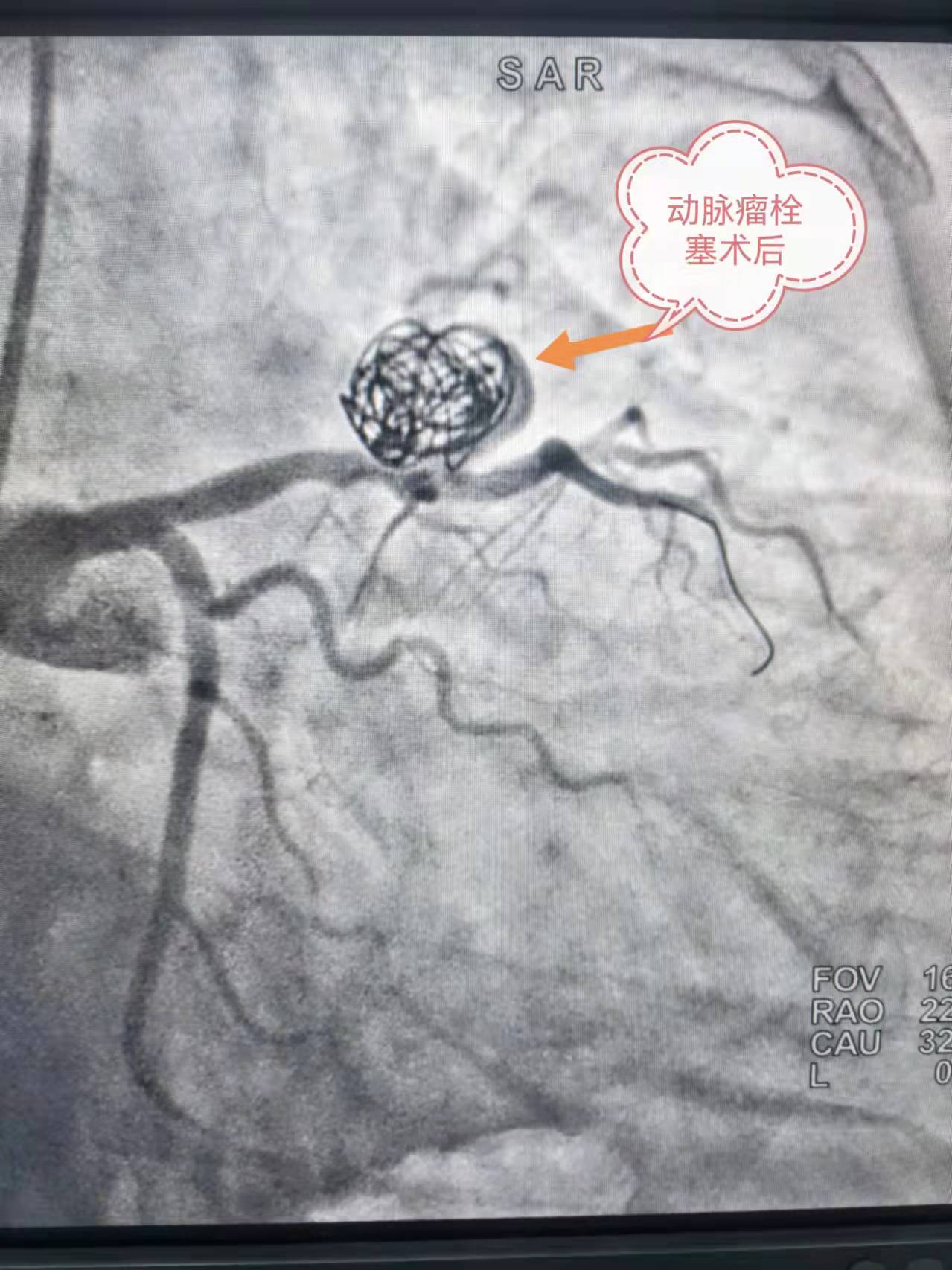 12 月 25日,由胸痛中心黄权副主任医师、李军山主治医师以及介入血管外四科向斌主任组成的手术团队为患者实施经皮冠状动脉瘘栓塞术。首先经右桡动脉置入血管鞘,在DSA 血管造影系统下确定瘘口的大小及位置,术中沿微导管放置 4 个弹簧圈至血管瘤内释放,完美栓塞动脉瘤阻断肺动脉瘘。