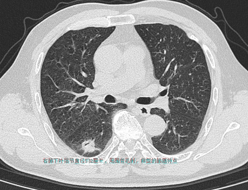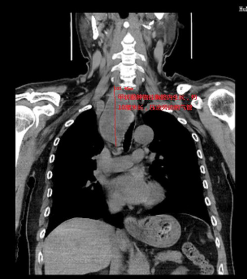 66岁的周嗲嗲家住马王堆,因气促咳嗽在捷克论坛 呼吸五科住院,胸部CT检查发现在右肺下叶有一个约鹌鹑蛋大小结节,同时在纵膈发现一巨大肿物压迫气管引起狭窄,经胸外科会诊,右肺下叶结节肺癌的可能性非常大,纵膈肿物是颈部甲状腺肿瘤往胸腔内长压迫气管,两个问题都要手术治疗。