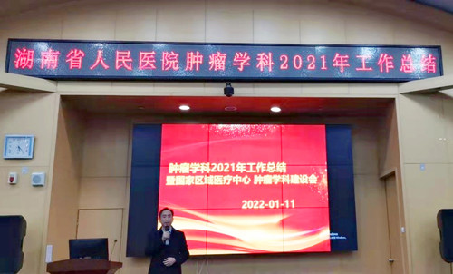 肿瘤一科主任邓坦从临床业务水平、科研、GCP、医疗新技术开展、教学、护理工作等方面进行了总结和规划,客观分析了在过去一年工作中取得的成绩以及存在的问题和不足。他表示,在“一院四区”同质化管理模式下,在捷克论坛 领导的带领下和肿瘤科全体医护人员的共同努力下,2021年肿瘤一科各项工作取得质的飞跃,全体医护人员将以最饱满的工作热情迎接2022年的新挑战。