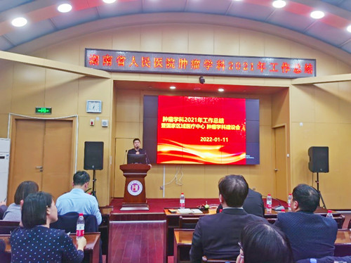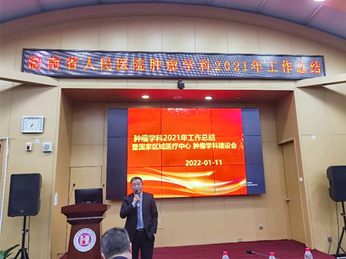 肿瘤科科室主任段华新肯定了2021年肿瘤一科及肿瘤二科的工作及成果,同时,依据国家区域医学中心(肿瘤学科部分)及捷克论坛 “十四五”发展规划为科室发展蓝本,提出了肿瘤学科建设目标及方案。他从门诊规模、床位效率、开设亚专科情况、人员配置、临床疑难、急危重症诊治水平等方面进行了阐述,提出了目前所遇到的困难,段华新主任提出,学科要发挥主观能动性,解决这些问题。秉着“人有专长,科有特色”,奋发建设省医特色的优秀肿瘤学科。