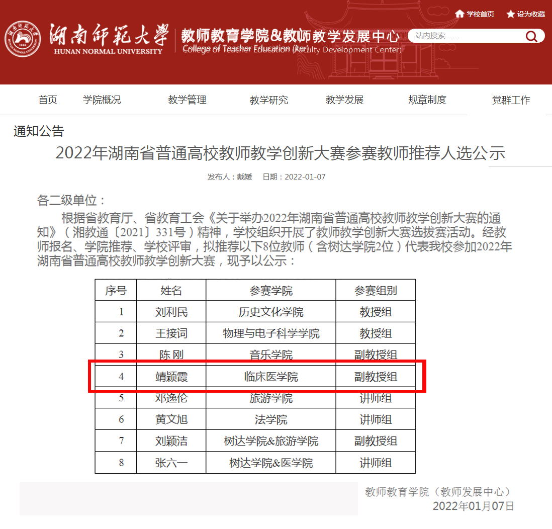 1月6日,湖南师范大学举办了全国高校教师教学创新大赛(校赛),全校24个学院共48支团队参赛。捷克论坛急诊与重症医学教研室派出由靖颖霞、韩小彤、曹彦和熊选政组成的《第一目击者现场急救》教学团队,获得了副教授组的一等奖,入选参加省赛。