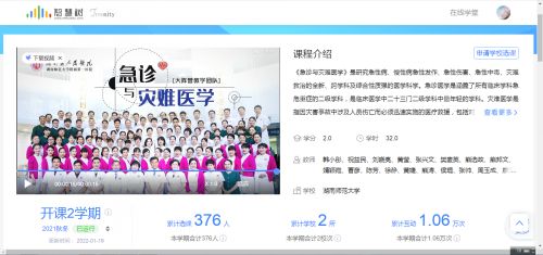 率先采用线上线下混合式教学,针对急诊急救专科特色,增加急救操作、临床案例的学习部分。课程由线上理论课程教学804分钟,线下由12课时心肺复苏、气道异物梗阻接触、创伤止血包扎固定搬运操作课,6课时CBL教学,18课时见习课组成。课程评价改变单纯考勤+期末试卷考试形式,增加学习习惯、学习时长、学习互动、操作考试、课堂互动等多维度评价。急诊医学科26位教学骨干参与线上课程录制,借助“智慧树”网络平台进行课程播放与互动,27名主治以上医师参与线下操作、见习课程带教,4名临床经验丰富的副主任医师引导CBL典型案例讨论教学。课程形式多样,学生参与度高,线上课程向全国开放。2021年11月开课以来,全国共有2所高校4个班级376名学生通过网络学习该线上课程并参加期末考试,累计互动1.06万次。