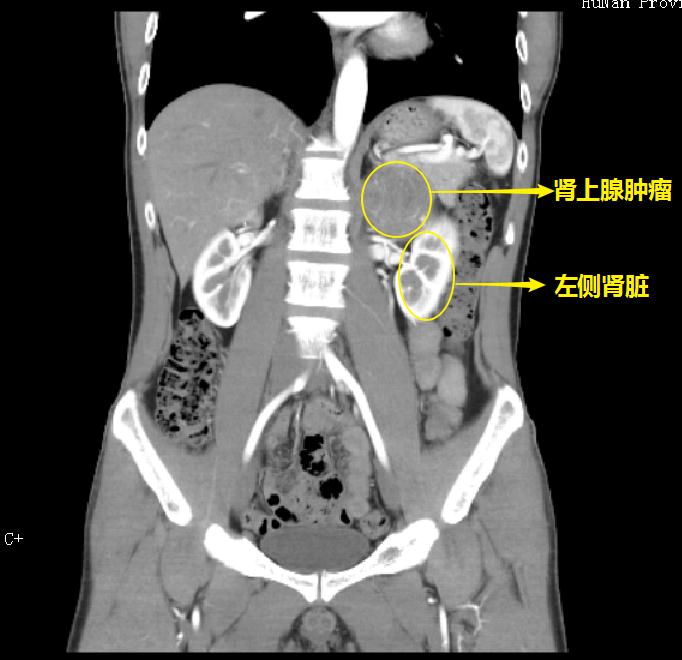 殷先生入院后,CT检查结果显示肿瘤直径约7cm向上推压膈肌和脾脏,内侧推压腹主动脉,手术治疗存在大出血的风险,但如果不及时采取手术治疗,肿瘤在体内如同一个定时炸弹,不仅会继续长大,随时还会使血压急剧升高并发心、脑血管意外危及生命。
