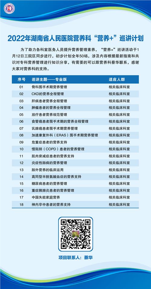 “营养+”巡讲活动计划全年50场,内容从外科骨科围手术期营养管理到食道癌、乳腺癌的术前营养管理,从危重患者的营养支持,再到肝病、肾病、炎症性肠病、糖尿病、肥胖等慢性疾病的营养全程管理,由营养科技师长蔡华进入各科室开奖,以让更多的人了解营养的重要性,从而减少术后并发症,缩短患者住院日。