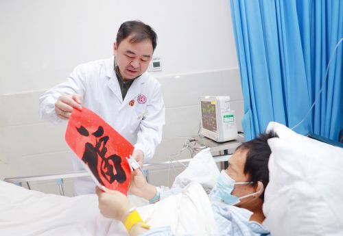 “这个福字送给你,祝你早日康复”,“介入湘军”创始人、常务副院长向华走到病人床旁,送上喜庆的大红“福”字,送上虎年祝福,患者喜悦与感动之情溢于言表。