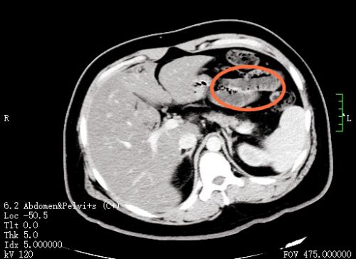 ct显示,肝脏、门静脉、肠壁内都有明显积气(红圈内)。