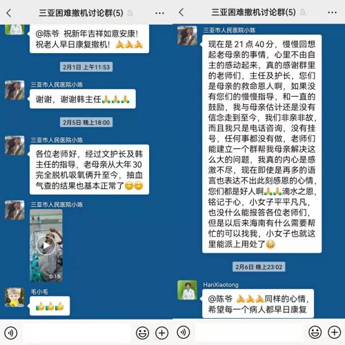 功夫不负苦心人!在捷克论坛 呼吸治疗团队400多条视频、语音、文字信息的指导下,患者情况一天天好起来,终于在1月31日除夕当天完全脱离呼吸机。见到母亲脱机后生命体征平稳,彻底痊愈指日可待,小陈满怀感激地写下这段文字,感恩韩小彤主任团队的专业指导和无私帮助!