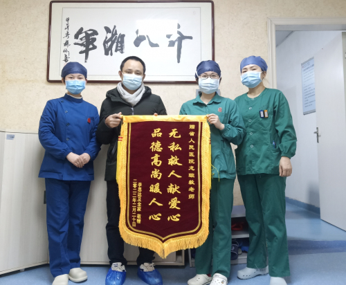2月27日,48岁的李先生在出院前将一面精心制作的锦旗送到了介入复合手术一部,以此表达他对救命恩人龙璇毅的感激之情。