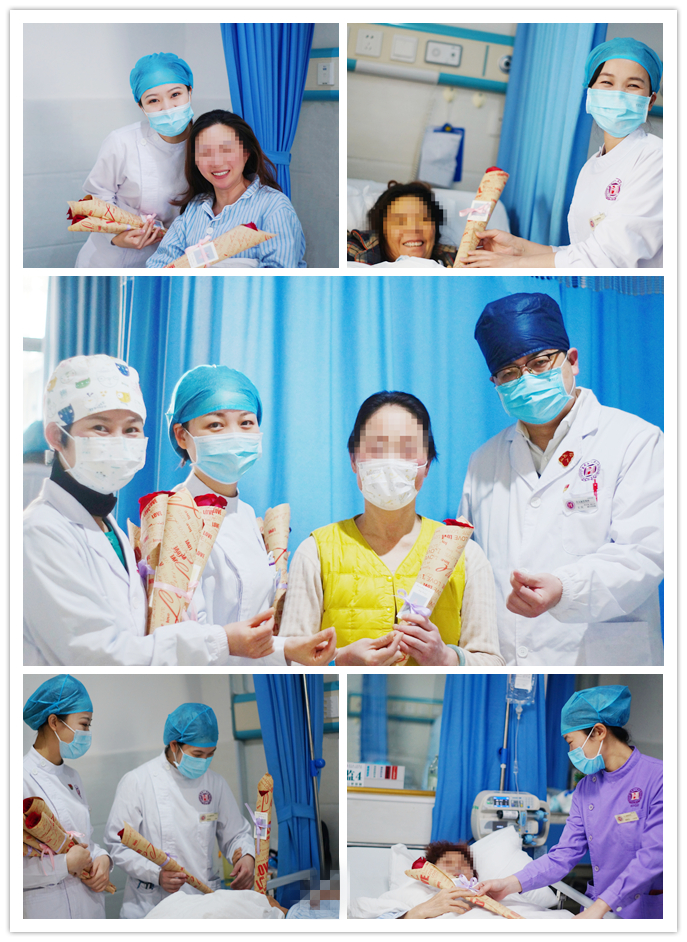 “这是我‘三八’节第一次收到礼物,太惊喜了,突然感觉好幸福啊。”收到医护人员亲手精心包装的红玫瑰,患者陈阿姨开心的像个孩子。“我是湘西那个乡旮旯出来看病的,从来没晓得这个节也没收到过礼物,你们那么做让我好感动哦,谢谢你!”田阿姨手握玫瑰激动地用方言连声道谢。