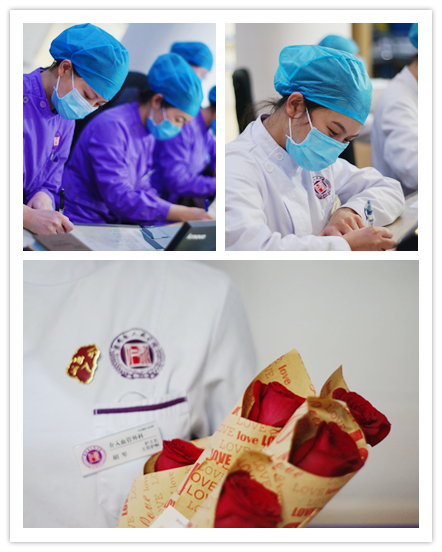 医护人员为患者写祝福卡和准备鲜花作为礼物