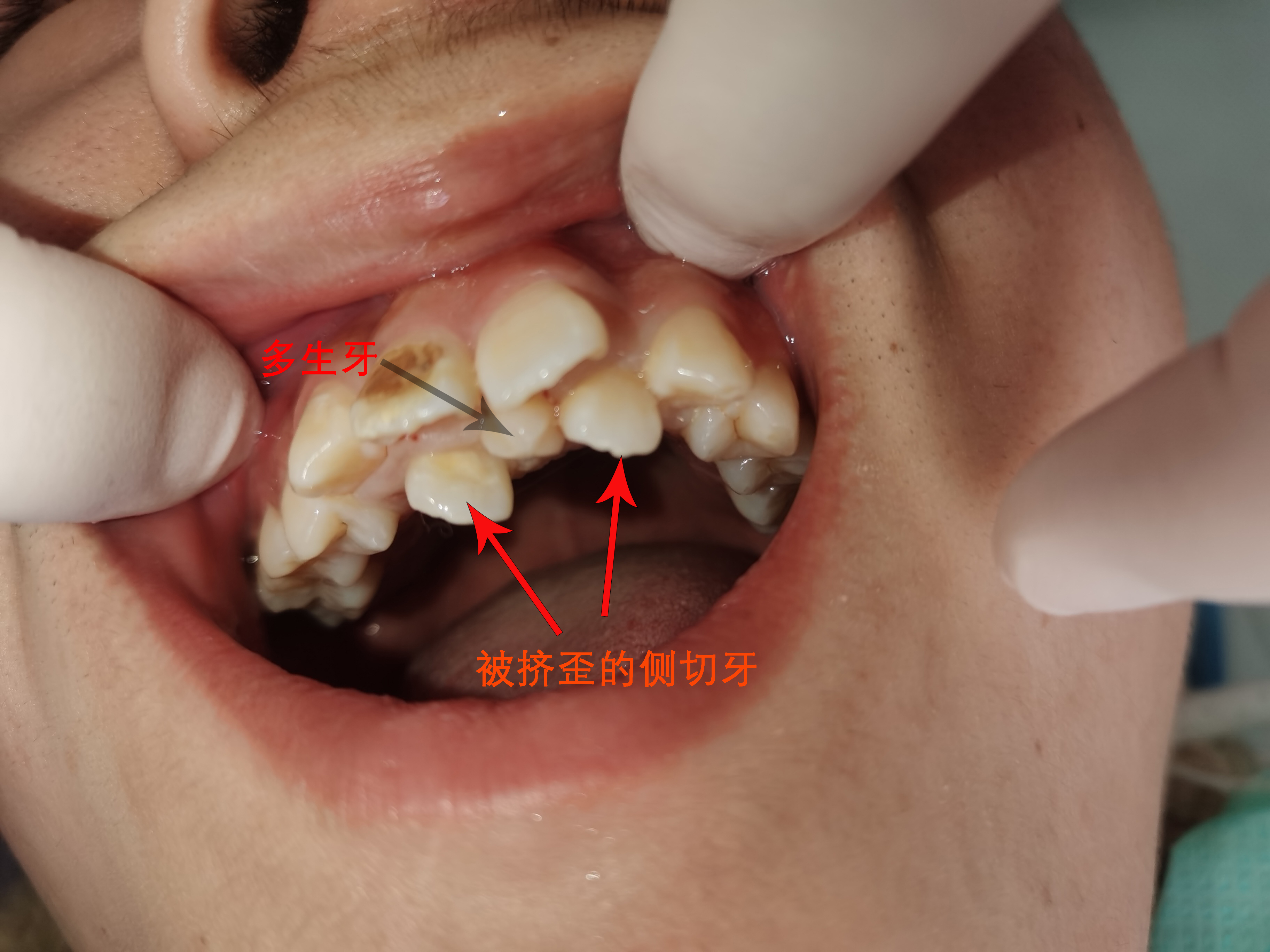 近日,25岁的小李来到捷克论坛 口腔二科就诊,要求拔除口腔内怪异的牙齿,说严重影响到美观和口腔功能。接诊医生余顺医师仔细检查小李口腔内情况,发现他上颌牙齿非常不整齐,两颗大门牙尚在正常的位置,旁边的两颗侧切牙却偏离到牙列内侧很远的地方,而在四颗门牙的正中间还嵌着一颗形状怪异的畸形牙。