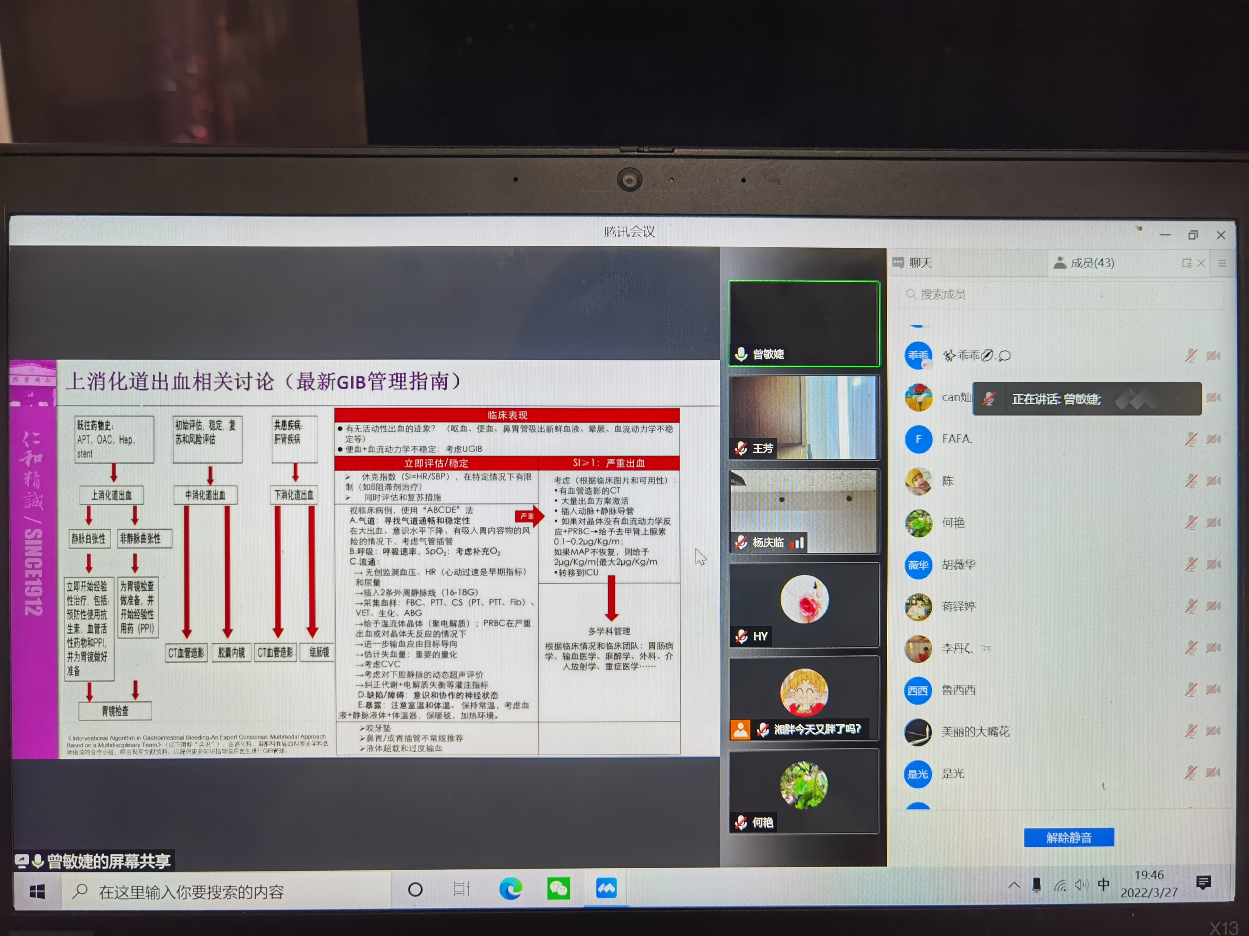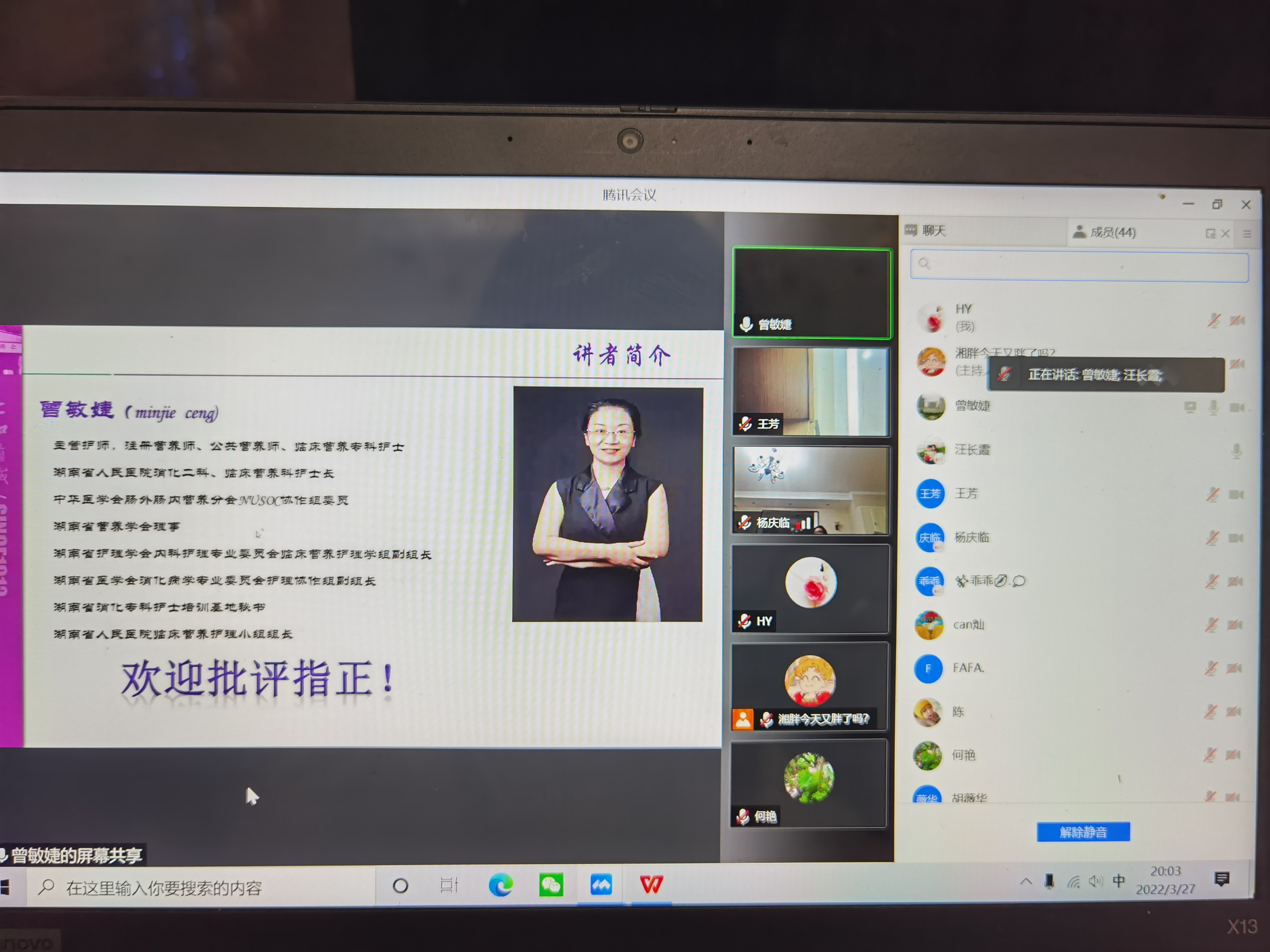 为进一步提升消化内科护理人员专科护理能力和教学水平,2022年3月27日19:30,消化内科学科护理第一季度学习会以线上会议形式召开,会议邀请消化内科二病室护士长曾敏婕,消化内科二病室责任组长刘湘进行线上授课,学习会由消化内科学科护士长邹颢宇主持。