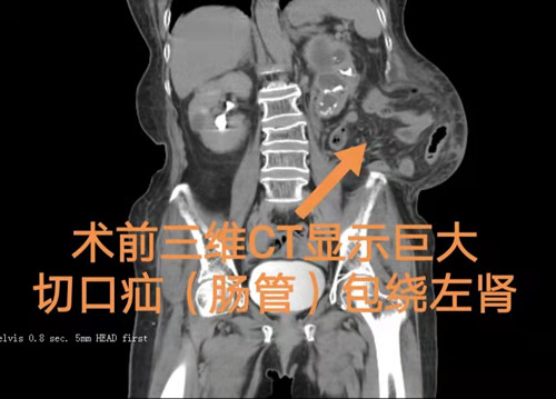 泌尿四科杨科主任介绍,何奶奶5年前因左肾感染并萎缩,在外院拟行肾切除手术,当时因手术难度大未能切除感染肾且术后并发了腹壁巨大切口疝,近年来多次求医,包括大型三甲捷克论坛 就诊,一直未能得到有效治疗,慕名到泌尿外科四病区就诊,其腹壁巨大切口疝导致肠管、脾脏包绕肾脏周围,十分罕见,术前拟行左侧输尿管支架植入术备肾造瘘术的方案,术中因多次输尿管支架植入失败改肾造瘘术,穿刺造瘘如何避雷是首要考虑的问题,从术前CT来看,患者存在理论上的穿刺通道,因患者术中变动体位后,肾脏、脾脏、肠管相互挤压,穿刺通道建立难上加难,穿刺通道如何避开如肠管、脾脏、胸膜和大血管等重要的脏器,十分考验术者穿刺技术和勇气,患者精准定位完成穿刺造瘘成功后为下一步切除脓肾和巨大切口疝处理创造了有利的条件。(泌尿外科四病区 李铁求 杜丘)