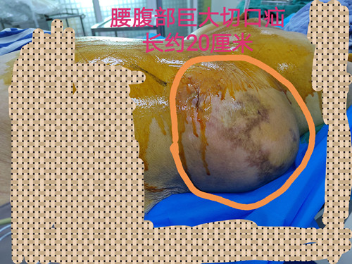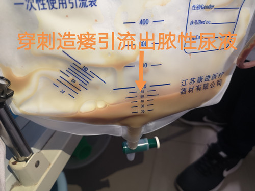82岁的何奶奶因腰腹痛不适,考虑左肾积脓合并左侧腰腹壁巨大切口疝昨日收住捷克论坛泌尿外科四病区,入院体查左侧腰腹部可见一大小约20cm的巨大包块,抽血查C反应蛋白261.33mg/L,中性粒细胞比值91%。术前检查显示左肾积脓并左肾结石、左肾萎缩、2型糖尿病、慢性胰腺炎、左侧腹壁切口疝,完善术前准备后,2022年3月29日在全麻下行左肾造瘘术,术中在B超引导下精准穿刺,左肾造瘘成功后见脓性液体流出,手术顺利。