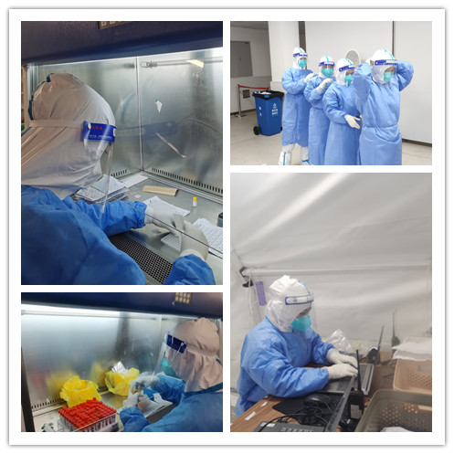 气膜实验室投入使用后,我们的工作正式开始,虽然做好了充分的准备,但大家面临的依然是一场严峻的挑战。负责加样的队员工作到手腕酸痛,负责提取的队员不断敲打着酸痛的腰背,负责点样封板的队坚持到最后出舱,负责签收复查的队员面屏上氤氲出蒸发的汗水,模糊了视线。这里,就是不流血的战场。而我们,一往直前,决不退缩。