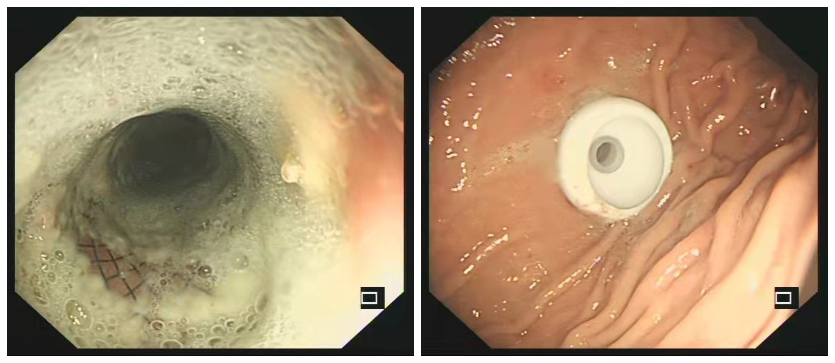 蒲阿姨既往有地中海贫血,现肺恶性肿瘤靶向治疗中,在外科手术无望的情况下,局部姑息性放疗成为唯一的希望。眼下如何尽快解决进食问题、改善营养状况是当务之急,考虑到蒲阿姨肿瘤位于食管上段,现有支架不能完全封堵瘘口,并存在支架脱落、压迫气道、支架内再狭窄等风险,消化二科吴明浩主任、陈智远博士在全面评估患者病情,并与家属充分沟通后,决定通过超细胃镜为患者行内镜下胃造瘘术。术后1天,蒲阿姨即可通过造瘘口进行肠内营养,营养状况得以改善,也未出现呕吐、腹痛,发热等不适。