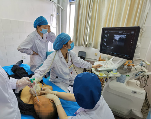 医生为谭爷爷进行超声引导联合球囊定位下的环咽肌肉毒毒素注射。