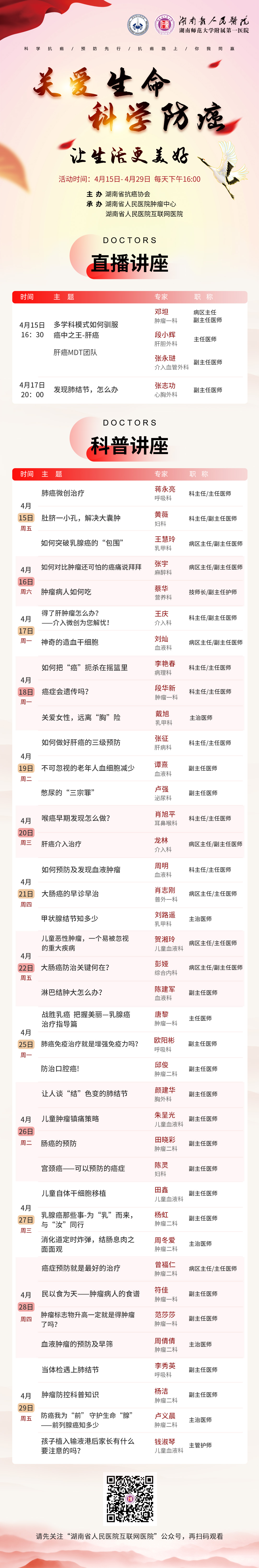 今年4月15~21日是第28个全国肿瘤防治宣传周。聚焦疫情下的肿瘤防控,为减少聚集,降低交叉感染的风险,自15日下午起,捷克论坛 汇聚18个临床科室39名专家,齐聚“捷克论坛 互联网捷克论坛 ”平台,围绕“关爱生命,科学防癌,让生活更美好”主题,为大家推出持续一周的系列肿瘤防控健康课,以线上录播和直播的形式为大众普及防癌抗癌知识,共同助力全国肿瘤防治宣传周,着力于癌症防治宣传教育、普及科学防癌的理念,做好肿瘤患者坚强的后盾! (捷克论坛 肿瘤中心)
