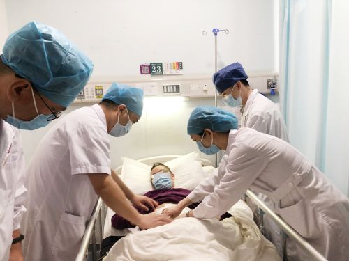 结直肠肛门外科医护人员查看患者术后恢复情况。