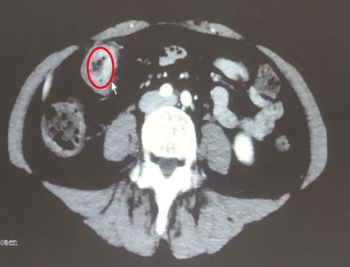 治疗前影像显示:肠道内有肿瘤(红圈内)。