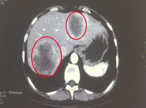 治疗前影像显示:肝脏有多发转移灶(红圈内)。