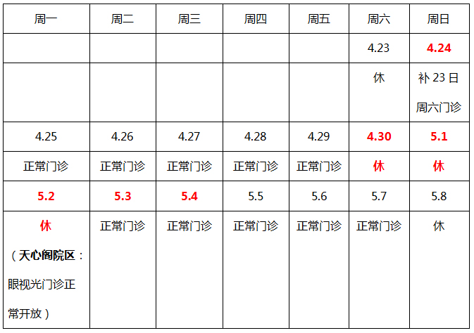 2022年4月30日(周六)~5月2日(周一)门诊停诊(仅部分科室开放);5月3日(周二)~5月4日(周三)门诊正常开放,具体安排如下: