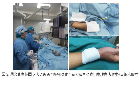 经检查发现,患者右侧大脑中动脉闭塞且为反复卒中复发的责任血管,脑组织存在明显低灌注失代偿,手术指征明确。但患者右侧大脑中动脉闭塞时间较长,手术难度大、风险高。另外,患者长期痛风性关节炎导致右下肢膝关节屈曲畸形,从右股动脉常规入路进行介入手术妨碍术中操作。在神经内科四病区主任周文胜介入团队仔细讨论后,决定施行右侧“桡动脉”入路进行右侧大脑中动脉球囊扩张术+支架成形术,助其恢复健康、降低卒中复发风险。