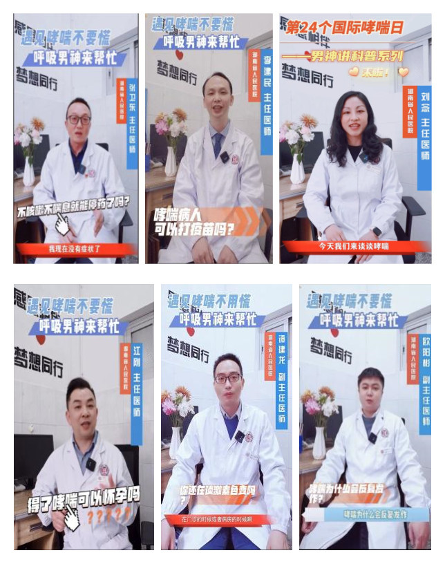 宣传周首先举办了“遇见哮喘不要慌,呼吸男神来帮忙”系列科普视频宣讲活动,张卫东主任、李建民主任、江刚主任医师、谭建龙副主任医师、欧阳彬副主任医师分别以“哮喘不咳嗽不喘息就能停药吗?”“哮喘病人可以打疫苗吗?”“得了哮喘可以怀孕吗?”“你还在谈激素色变吗?”“哮喘为什么会反复发作?”为题为大家解答了常见的认识误区和疑惑。