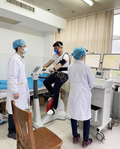 医务人员正在对朱先生进行心肺运动试验,精准评估其心肺功能