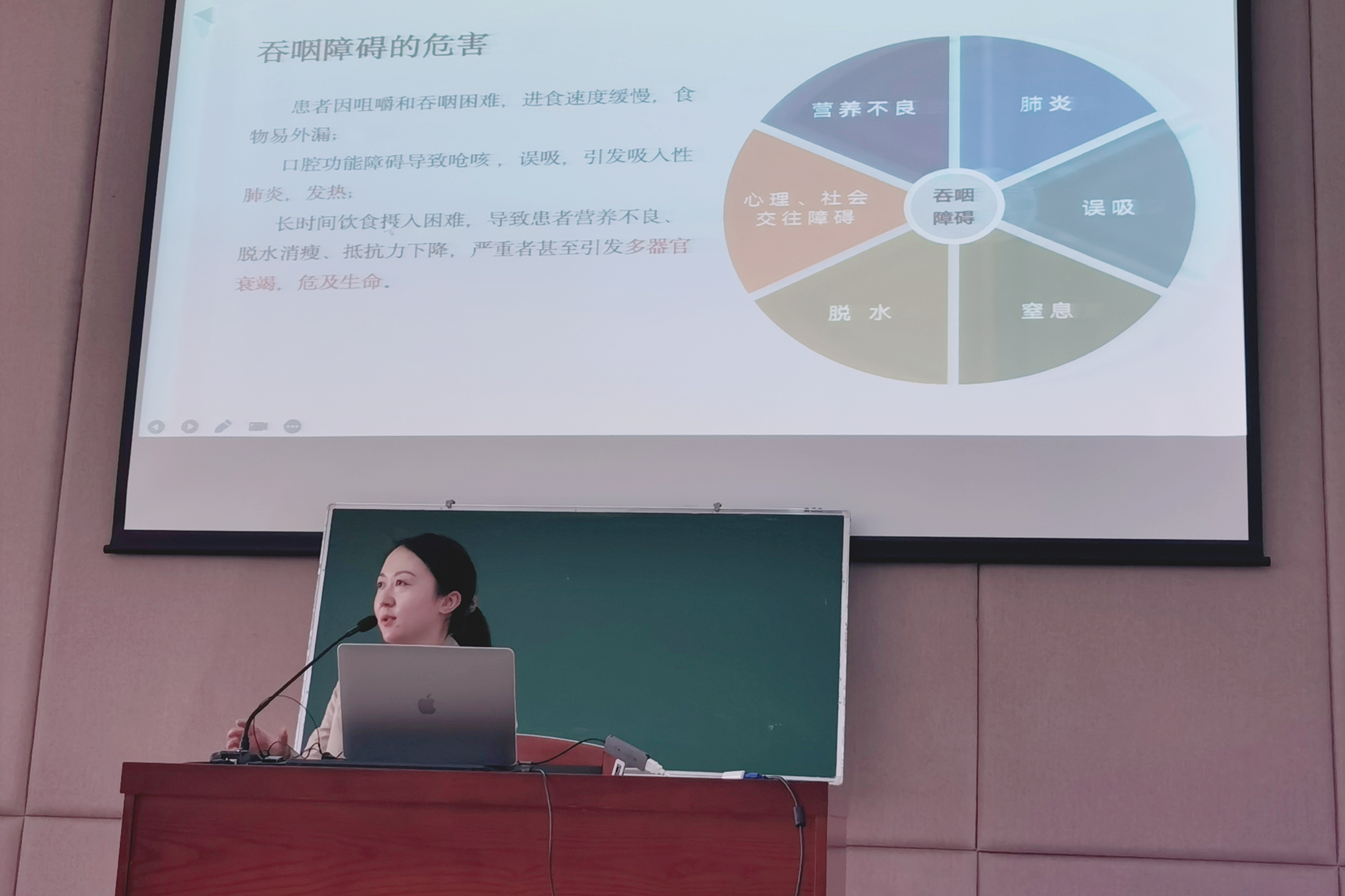 吴亚岑主任介绍道,吞咽是神经肌肉反射性协同运动完成的一种生理功能,能使食团从口腔进入胃,老年人从口腔前部到贲门的吞咽通道中的某一部分发生病变,吞咽反射路径的某一部分受损或受到邻近病变的影响,皆可导致不同程度的吞咽障碍,出现吞咽不畅,食管内食物滞留,饮食向鼻腔反流或部分进入气管等病症,这就是我们常说的吞咽功能障碍。患者常因饮水呛咳、吞咽困难、误吸导致肺部感染,甚至窒息死亡,也可因进食困难而引起脱水、电解质及营养物质摄入不足造成严重的营养不良。此外,吞咽障碍对老年人生活质量、心理等方面都会产生严重的负面影响,超过50%的患者会减少进食量,44%出现体重下降,41%在进食时有紧张或恐慌心理。