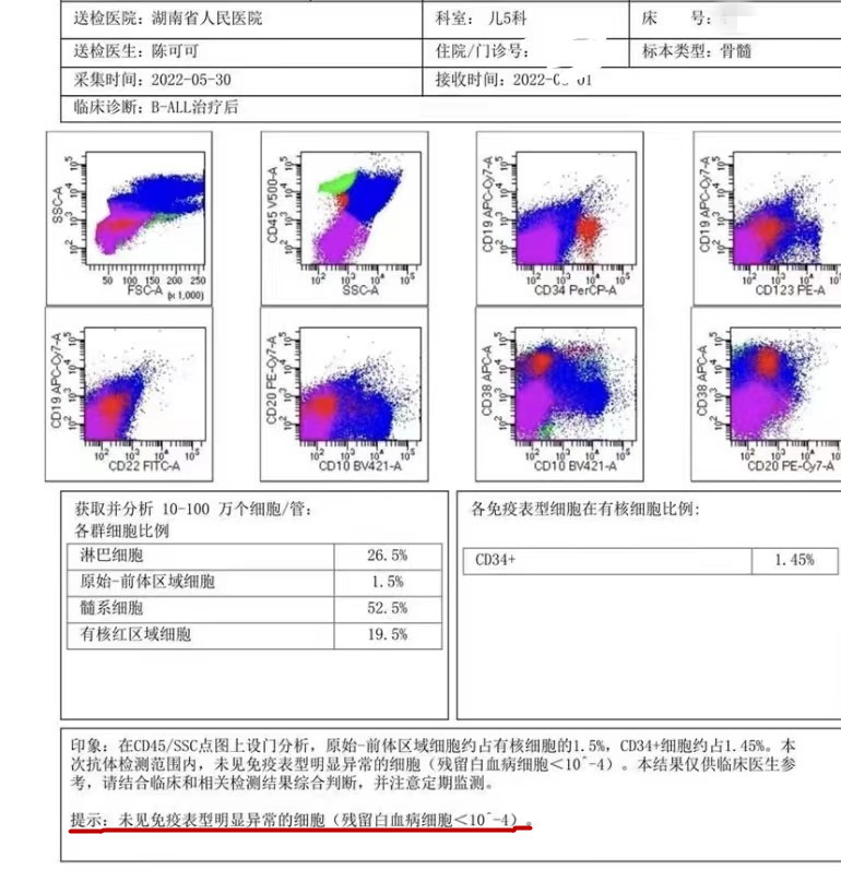 在贺湘玲主任手上,有一张血液肿瘤免疫残留检测报告单,报告单上提示:未见免疫表型明显异常细胞。这对于俊俊来说,无异于最好的儿童节礼物,白血病细胞微小残留清除为他接受骨髓移植创造了有利时机。这是湖南省首例应用贝林妥欧单抗新型免疫疗法成功治疗儿童难治性急性淋巴细胞白血病的病例。