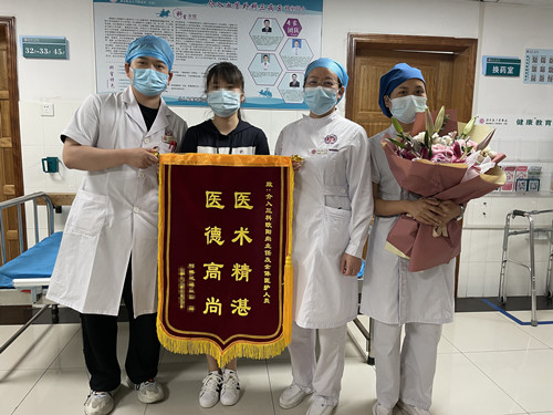 刘满哥的妻子将一面锦旗送到介入血管三病区,表示感谢